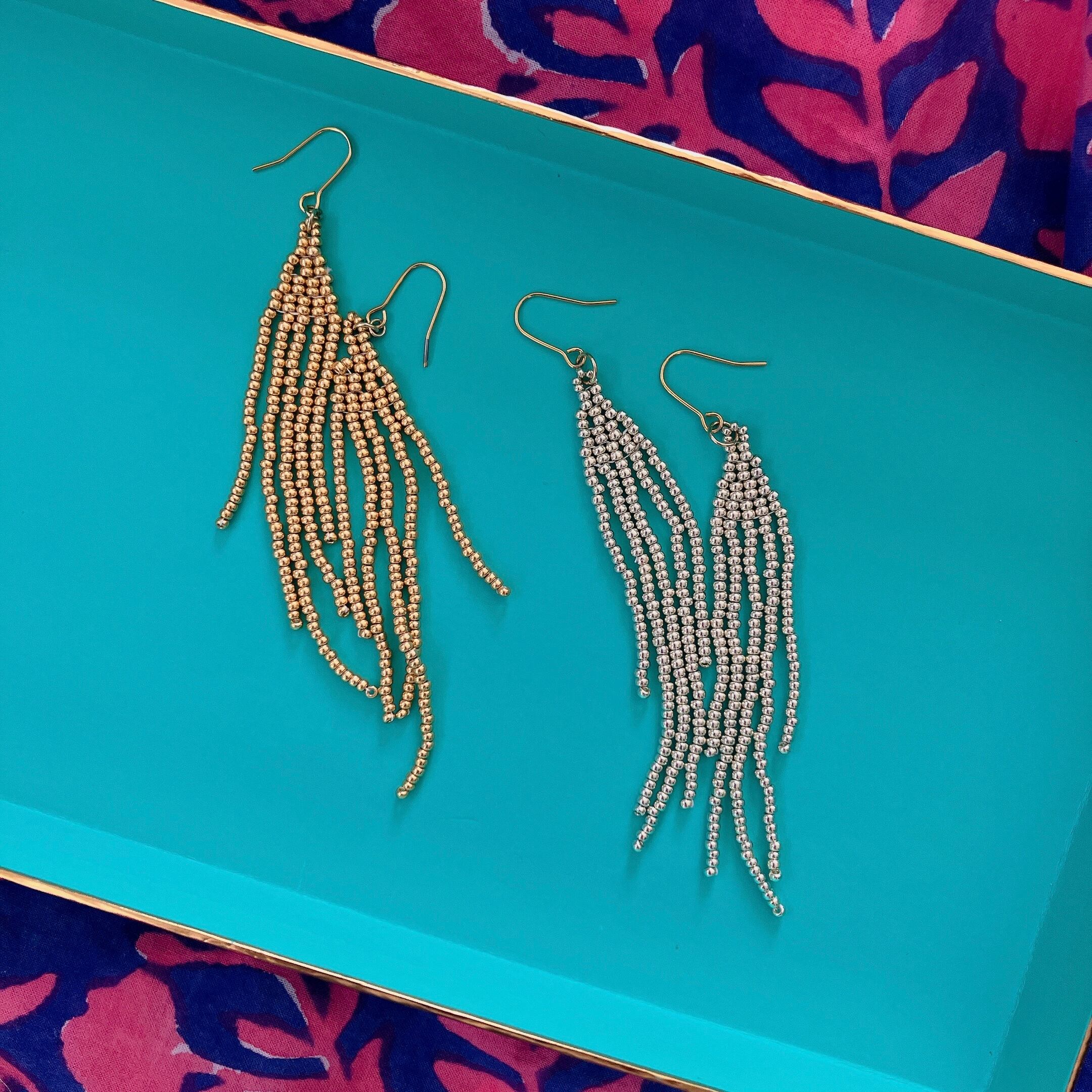 三角フリンジモチーフのピアス/イヤリングです。動きにつれて揺れるフリンジは、シンプルながら存在感を放ち、耳元を華やかに彩ります。