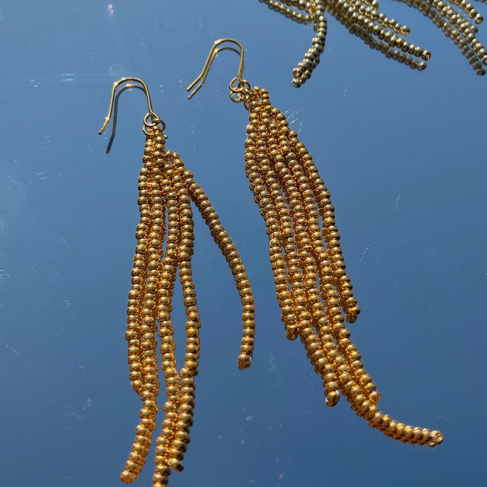 ゴールドの小さなビーズを繊細に束ねたデザインは、まるで午後の陽光をそのまま映しとったよう。